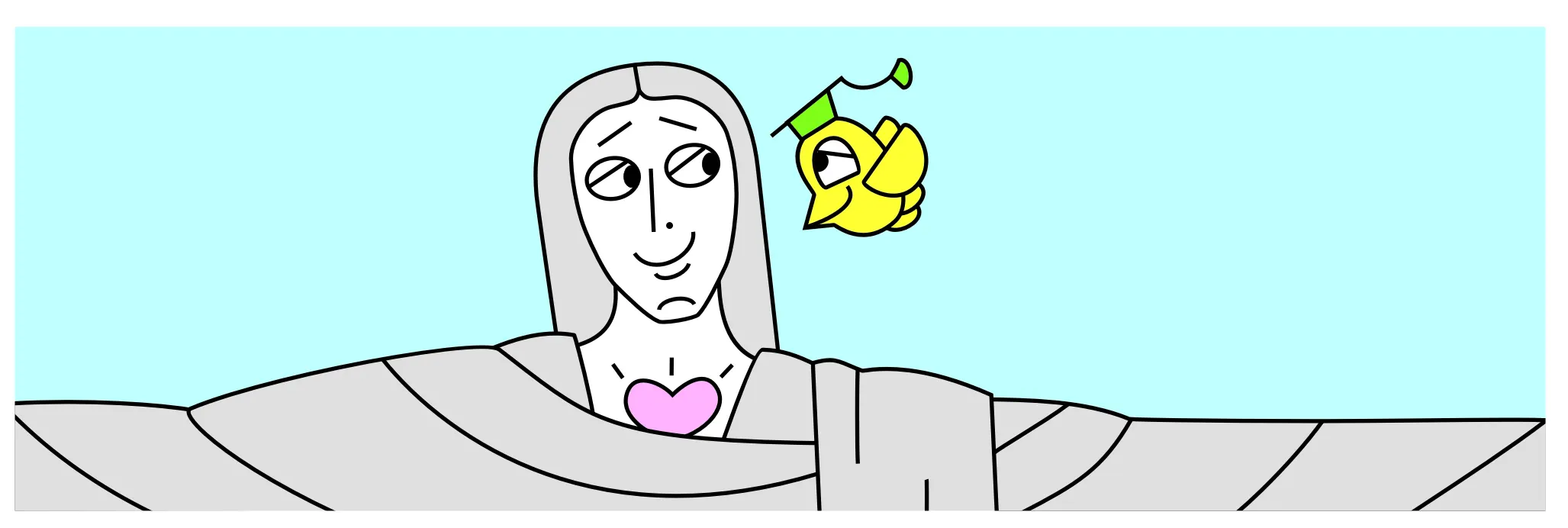 Ele é o pássaro-professor que conta as histórias do Rio para os estudantes.