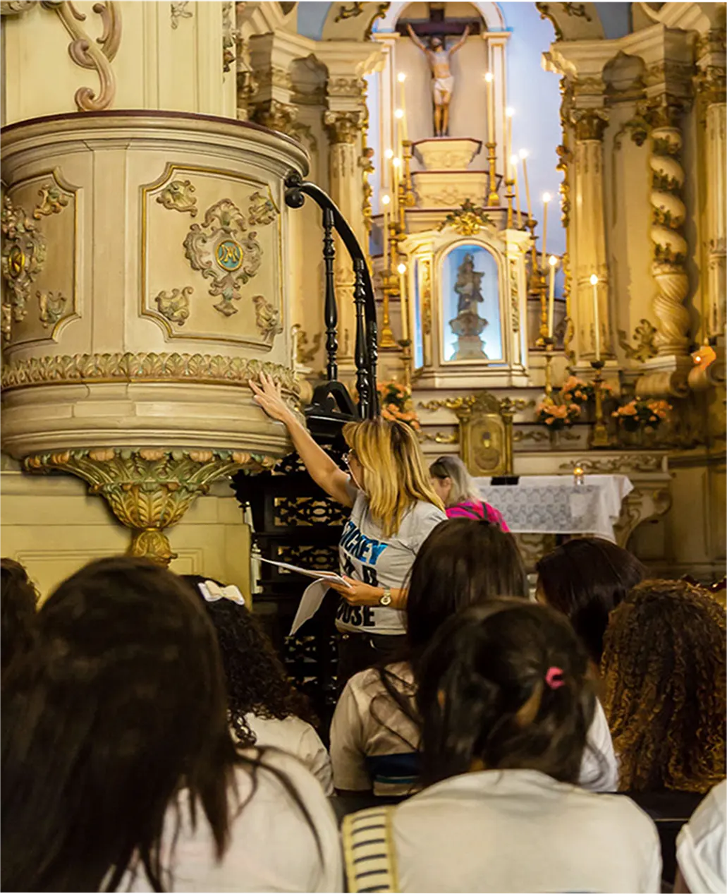 Transmite o significado do simbolismo religioso presente nas talhas, pinturas e demais elementos de igrejas históricas cariocas. Visita a Antiga Sé e as Igrejas de Nossa Senhora da Lapa dos Mercadores, do Mosteiro de São Bento, de Nossa Senhora da Candelária e de Nossa Senhora da Glória. O roteiro é definido com a escola.