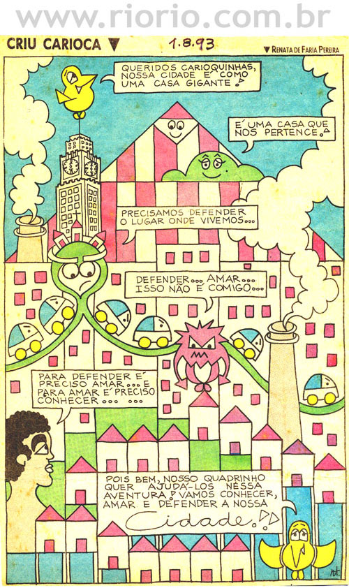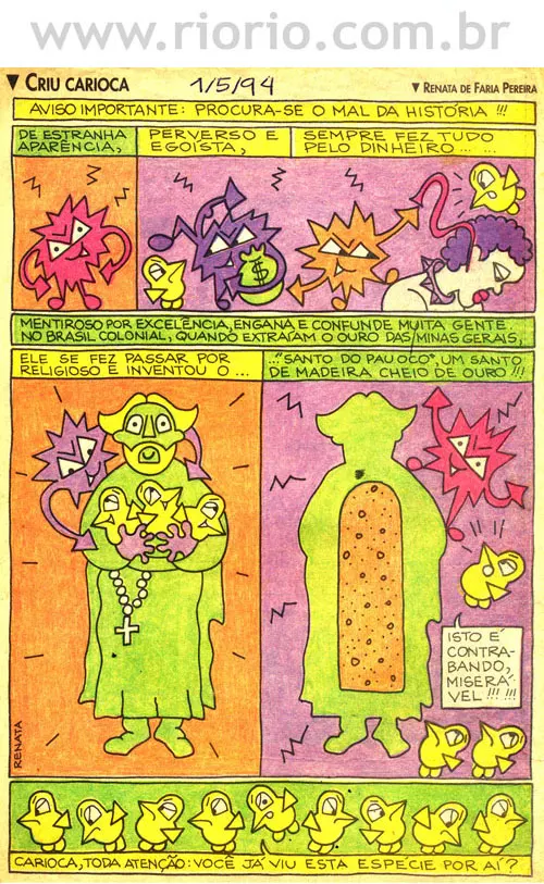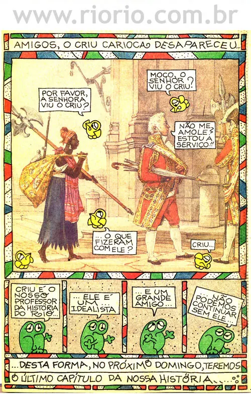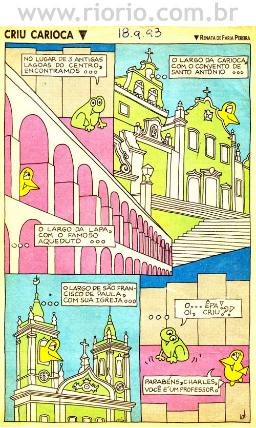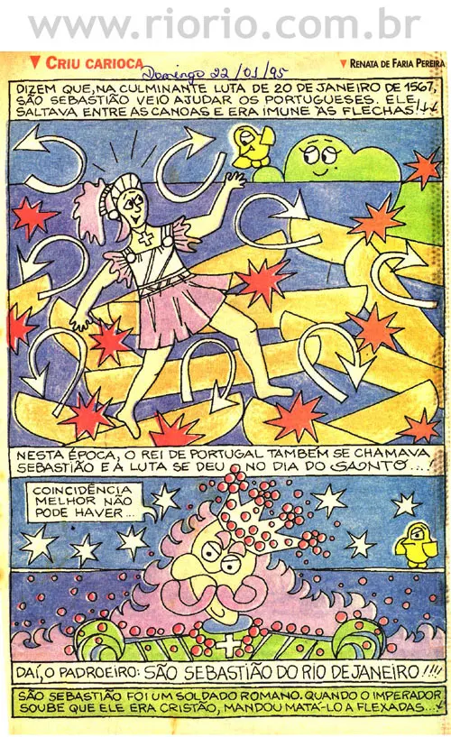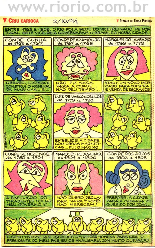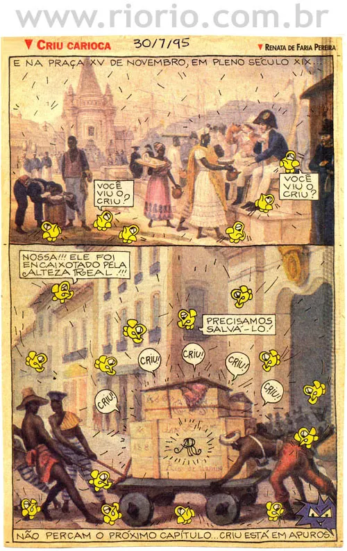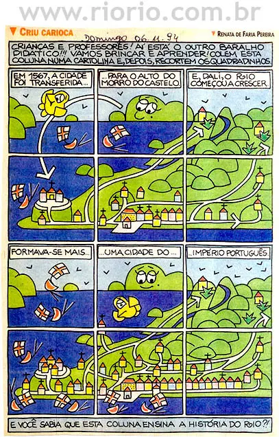 Apresentam-se, a seguir, alguns quadrinhos da coluna Criu Carioca, publicada aos domingos, em um jornal da cidade do Rio de Janeiro, entre os anos de 1993 a 1995. Os quadrinhos sobre a história do Rio que reproduzimos aqui são para o seu entretenimento! Procuraremos sempre que possível colocar novos quadrinhos! Bom proveito!