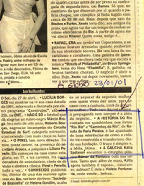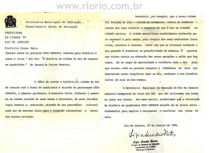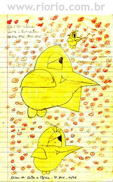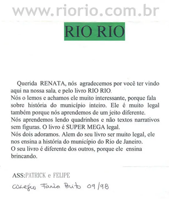 Conheça, a seguir, algumas cartas sobre o livro RioRio, escritas por professores e estudantes da cidade. Apresentamos também dois prêmios, um documento do Escritório dos Direitos Autorais, um folheto do CCBB, a primeira capa do RioRio e alguns recortes de jornal.